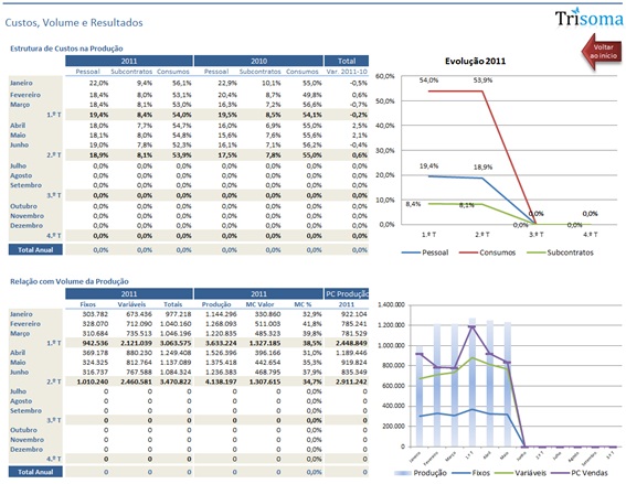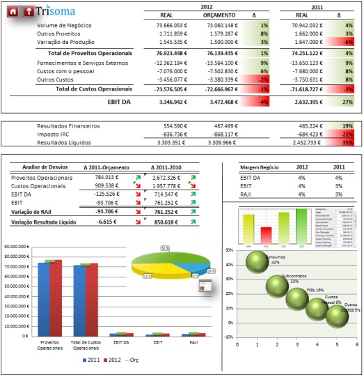 O sistema de reporting da Trisoma é um sistema proprietário desenvolvido sobre o Microsoft Excel, totalmente integrado com sistema Primavera e/ou Navision, visando apoiar a gestão no acompanhamento da implementação financeira dos planos de negócios, assegurando a operacionalidade dos mesmos através da elaboração de tableaux de bord com informação económica e financeira discriminada.